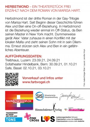 Jede*r weiss, dass es in einer Beziehung Höhen und Tiefen gibt. Das Stück Herbstmond spielt nicht nur in Hamburg, sondern auch in New York und Luzern. Ben nimmt eine neue Herausforderung in Form eines Auslandsemesters in New York an und lernt Pedro kennen. Ist Pedro schwul? Ist das Liebe auf den ersten Blick? Für Ben scheint es so. Doch er kann trotz allem seinen Ex-Freund Alex nicht vergessen. Es verbindet sie mehr, als sich die beiden eingestehen möchten.